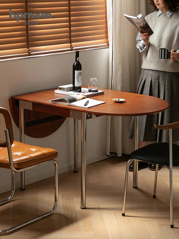 北欧ヴィンテージ風楕円形折りたたみ天然木ダイニングテーブルセット-中古風味も魅力!省スペースで使いやすい、家庭用伸縮式食卓。