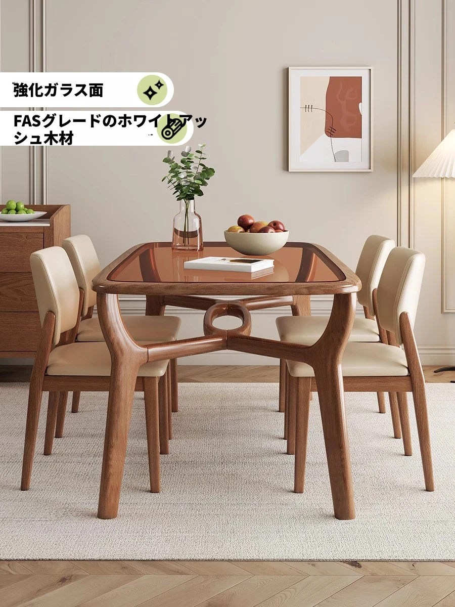北欧シンプルデザイン ★ 上質ホワイトアッシュ無垢材ガラスダイニングテーブルセット ★ 新中式スタイル・長方形テーブル&チェア ♡ 家庭用にぴったり!