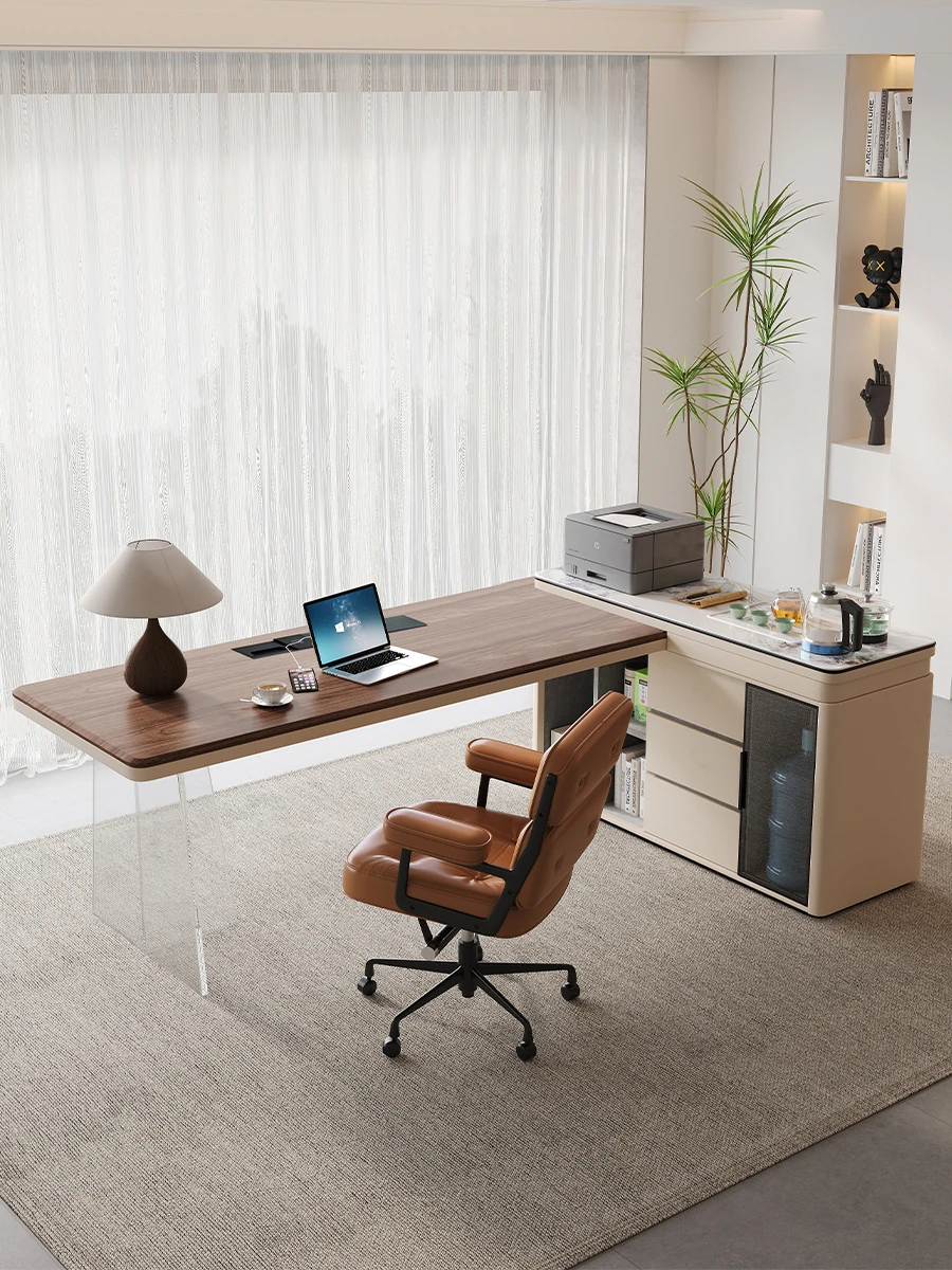 イタリアンミニマルデザインの角型無垢材デスク|オフィスとティータイムに最適な2in1デスク|アクリル製の高級感あふれる社長用パソコンデスク