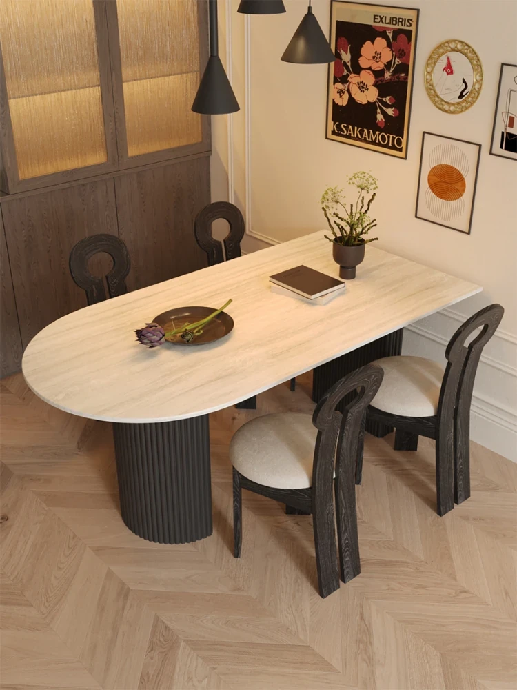 2025年新款!中古風洞石岩板餐桌 - 小户型法式復古侘寂デザイン、半円形で壁に寄せて使える洽談テーブル。おしゃれなインテリアにぴったり!