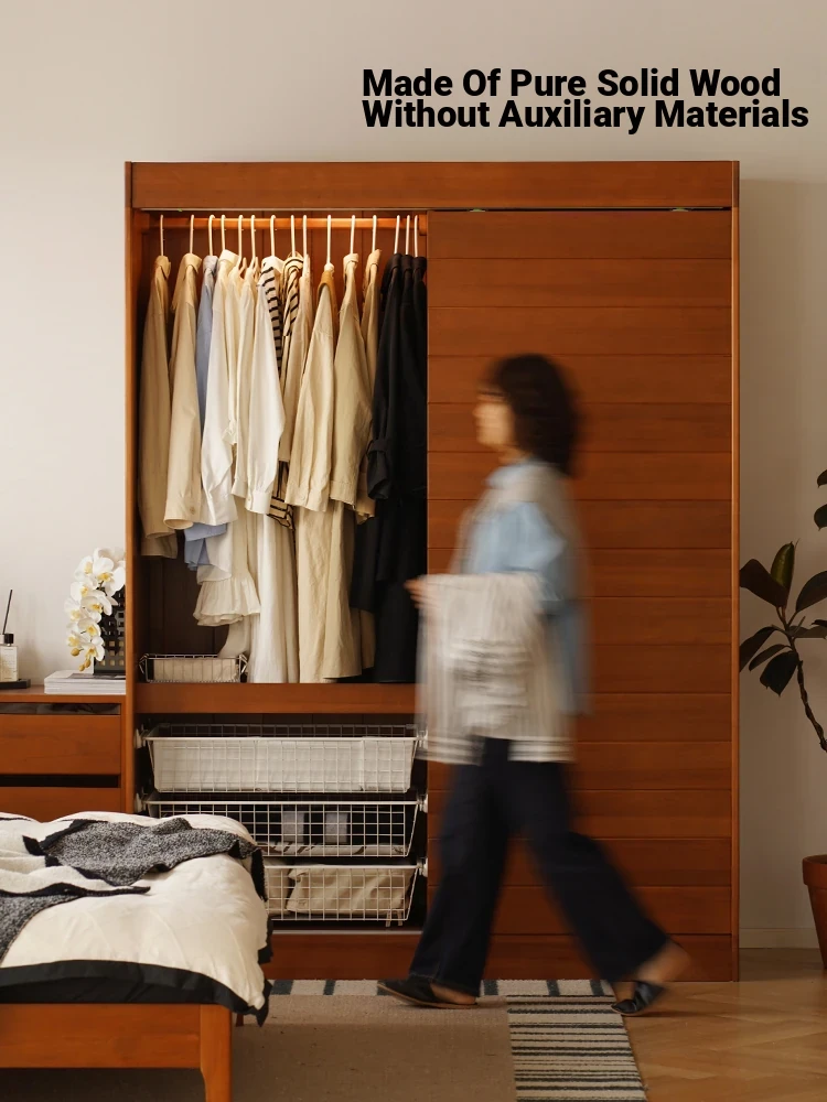 Nordic Vintage Solid Wood Sliding Door Wardrobe - Stylish Retro Bedroom Closet