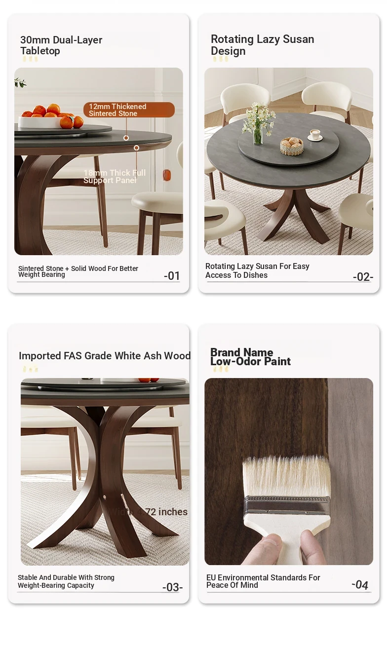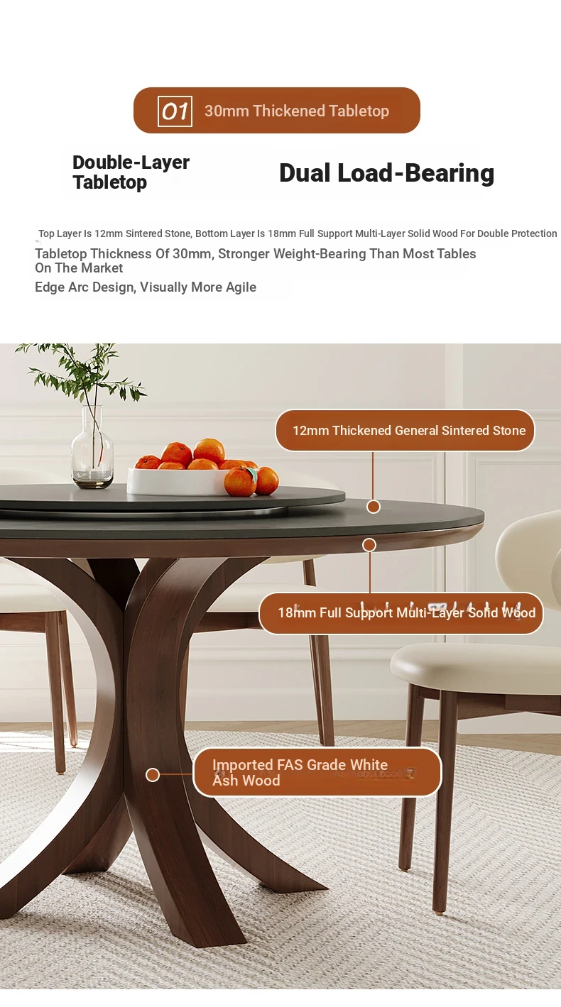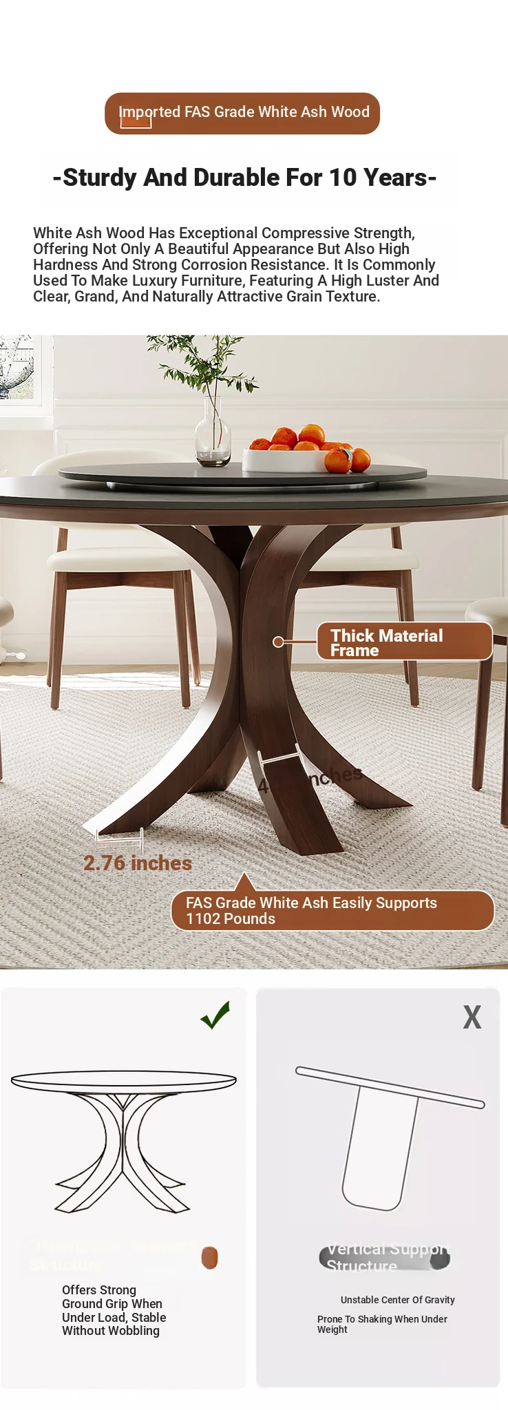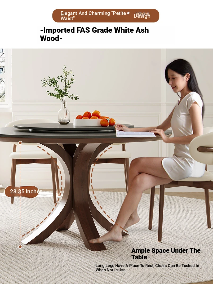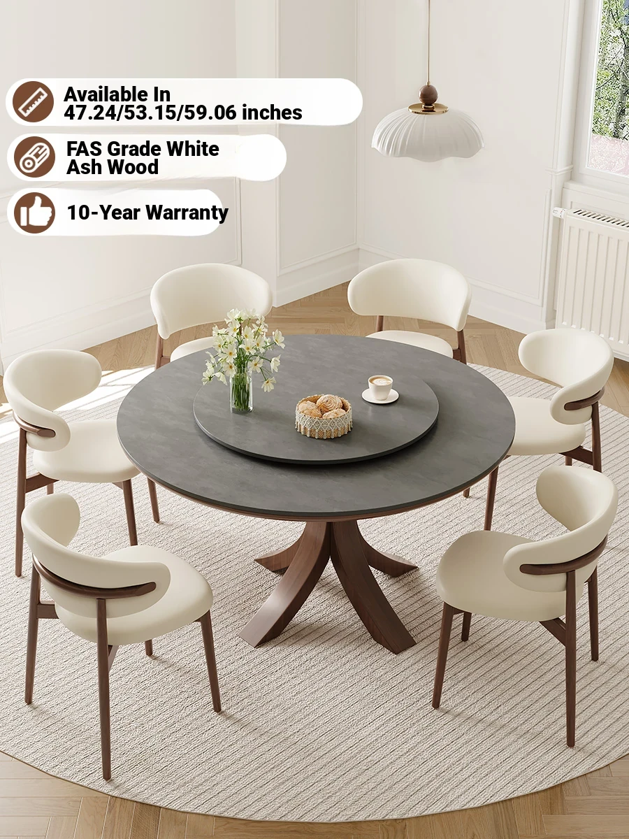 Ash Wood Solid Round Dining Table with Lazy Susan - Vintage Wabi-Sabi Style High-End Round Sintered Stone Table for Home with Full Support Base
