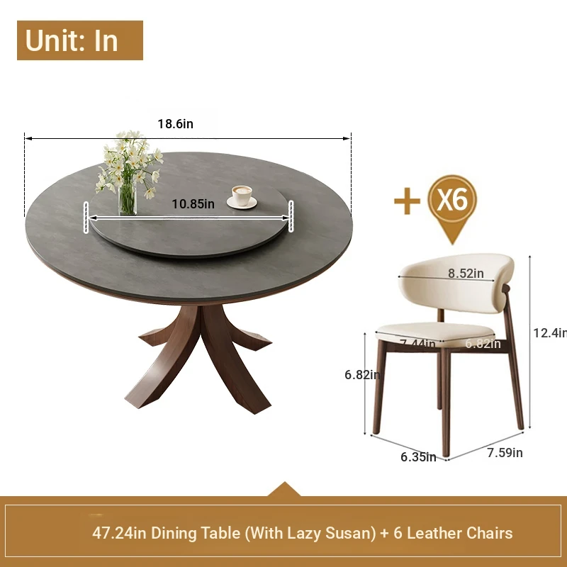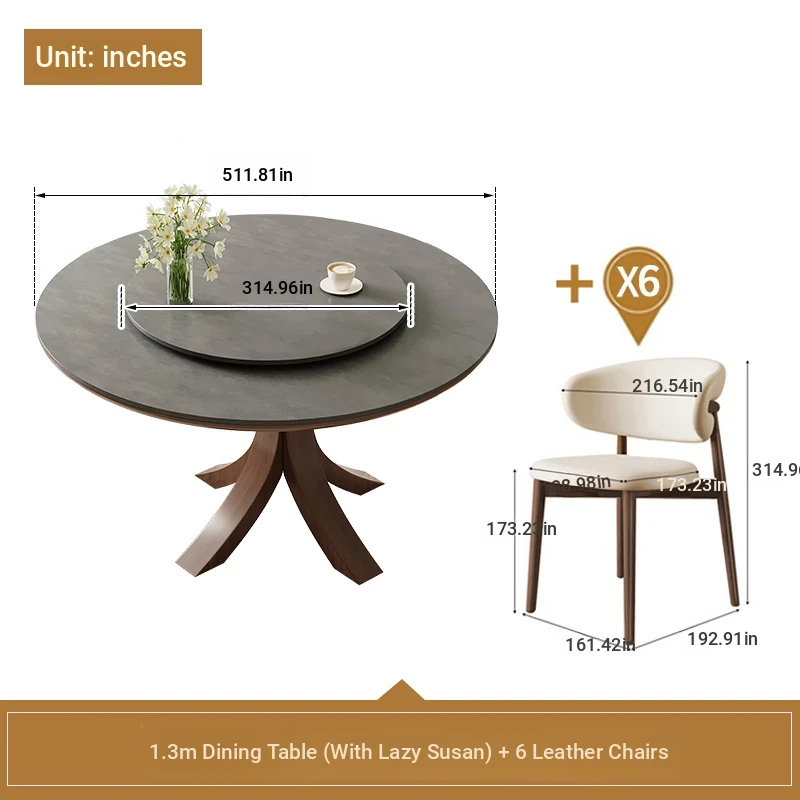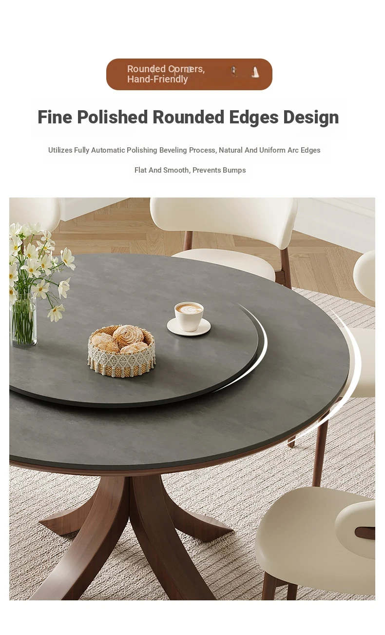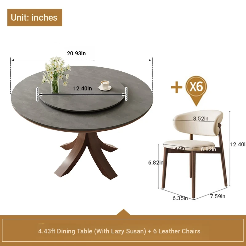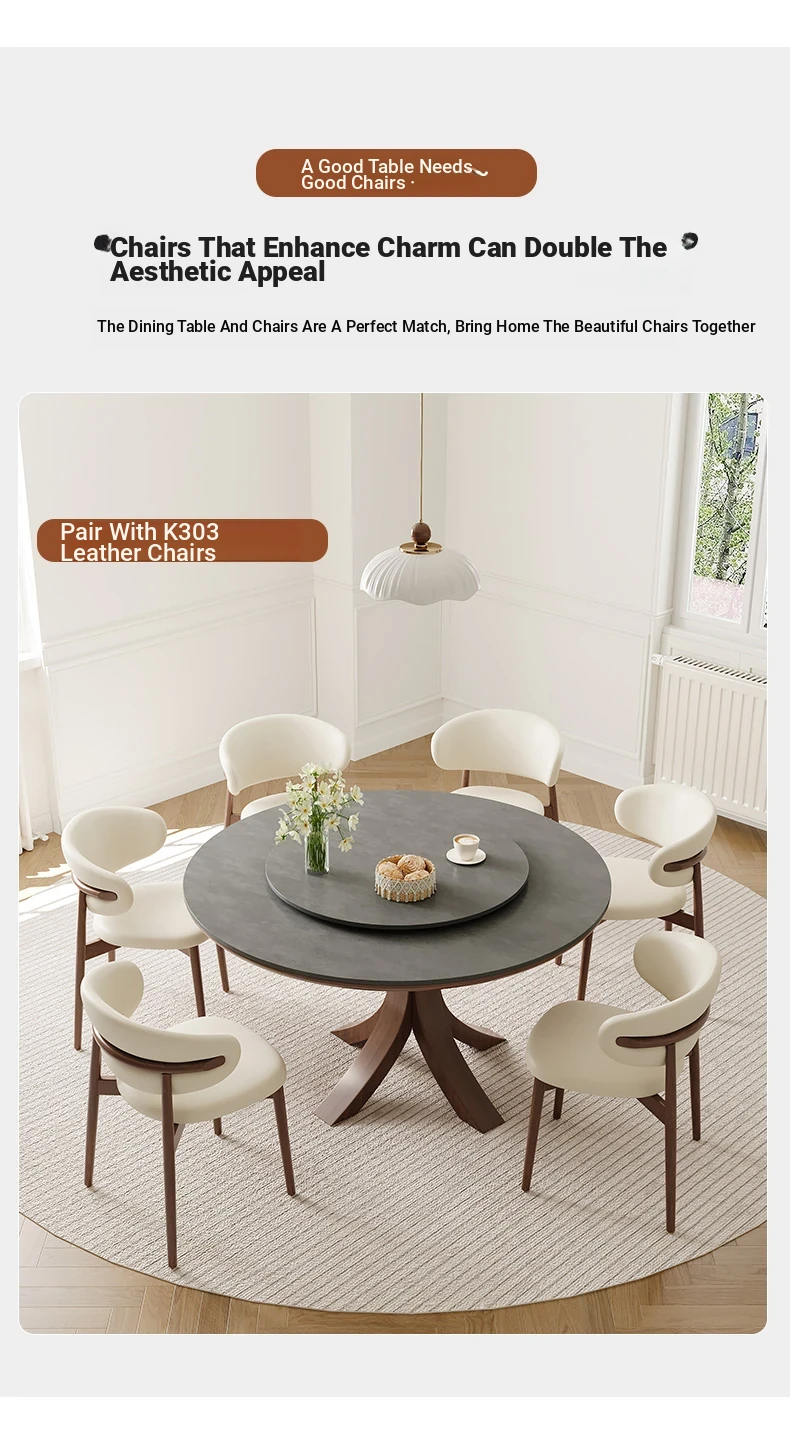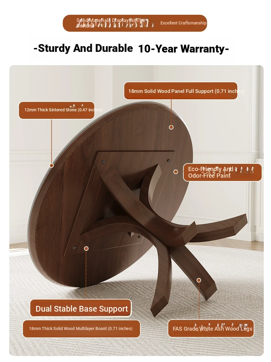 Ash Wood Solid Round Dining Table with Lazy Susan - Vintage Wabi-Sabi Style High-End Round Sintered Stone Table for Home with Full Support Base