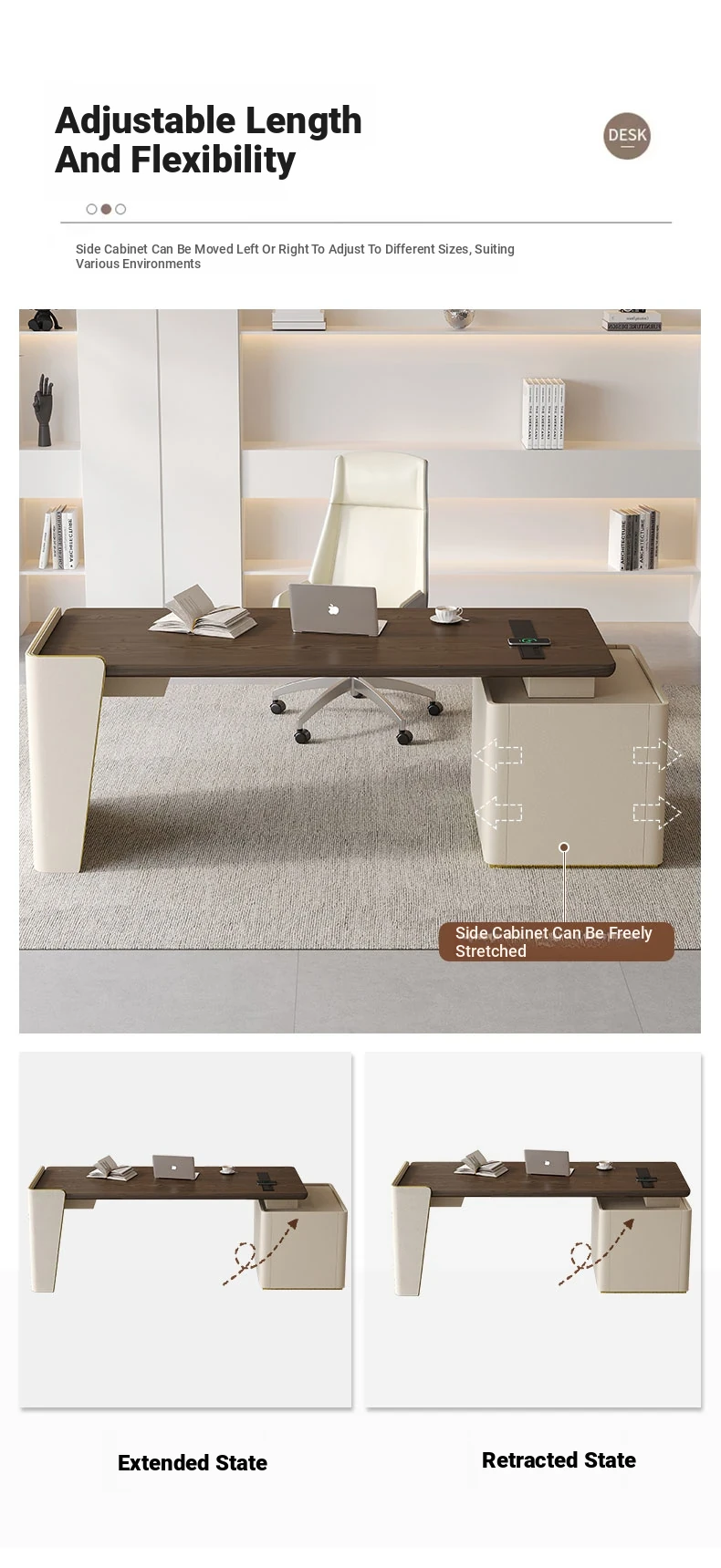 Vintage Minimalist Home Office Desk - Designer Luxury Computer Desk with Adjustable Saddle Leather Cabinet